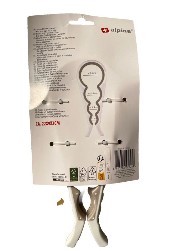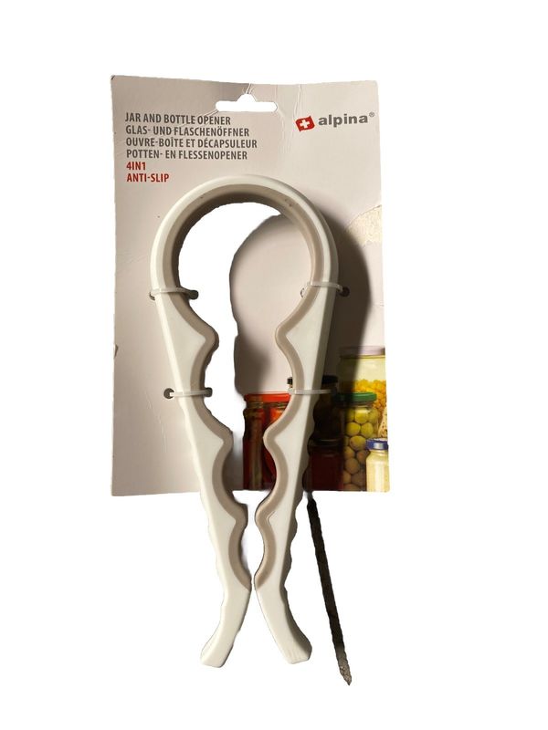 Falls Sie Probleme dabei haben, fest verschlossene Flaschen oder Gläser zu öffnen, ist hier die Lösung für Sie: Der Glas- und Flaschenöffner von Alpina. Er sorgt dafür, dass sie an den Deckeln nicht abrutschen, dank Anti-Slip.
