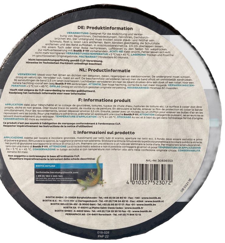 Geeignet für die Abdichtung und Verklebung von Regenrinnen, Dachabdeckungen, Fallrohren, Dachdurchbrüchen etc. Der Untergrund muss trocken sowie staub- und fettfrei sein. Schmutz, Rost und Lack entfernen. Beim Abrollen gleichzeitig die Schutzfolien entfernen und das Band aufkleben. In Anschlussbereichen 2,5cm überlappen lassen. Mit einem Tuch oder einer Rolle nachpressen. Luftblasen zu den Seiten wegdrücken.